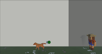 "Play Fetch" – Suņa rotaļas funkcionalitātes prototips. Spēlētājs var izsaukt suni, lai tas noķertu bumbiņas.